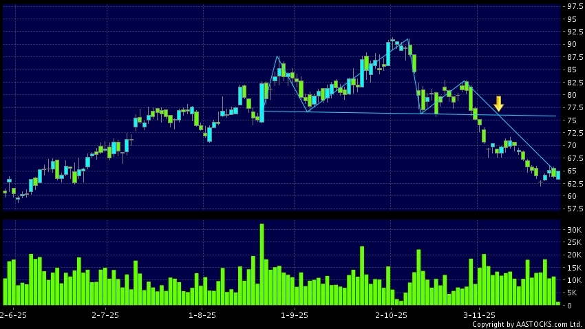 舜宇光学科技(02382.HK) +0.650 (+1.019%) 沽空 $2.37千万; 比率 15.104% 呈现头肩顶向下突破。现价报64.800,上升1.567%,成交量1.49百万股,成交额9.62千万。