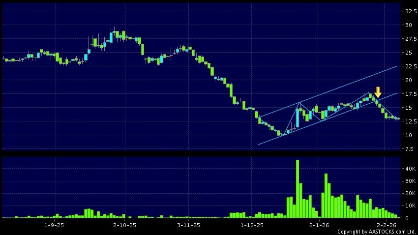 区域突破指股价在过去的一段时间只在一个范围在内活动,然後股价下跌作出突破,跌穿区域的底部,技术走势偏软。(港股报价延迟最少十五分钟。沽空资料截至 2026-02-06 16:25。)