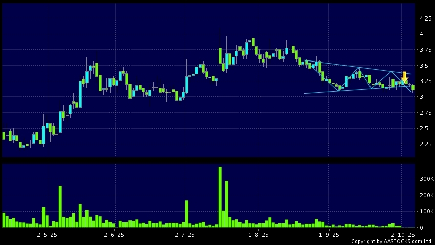 三角形向下突破是指股价的波幅渐渐收窄,在图表上形成三角形般的状态。股价在三角形的末端向下突破,下跌趋势形成,技术走势偏软。(港股报价延迟最少十五分钟。沽空资料截至 2025-10-15 16:25。)