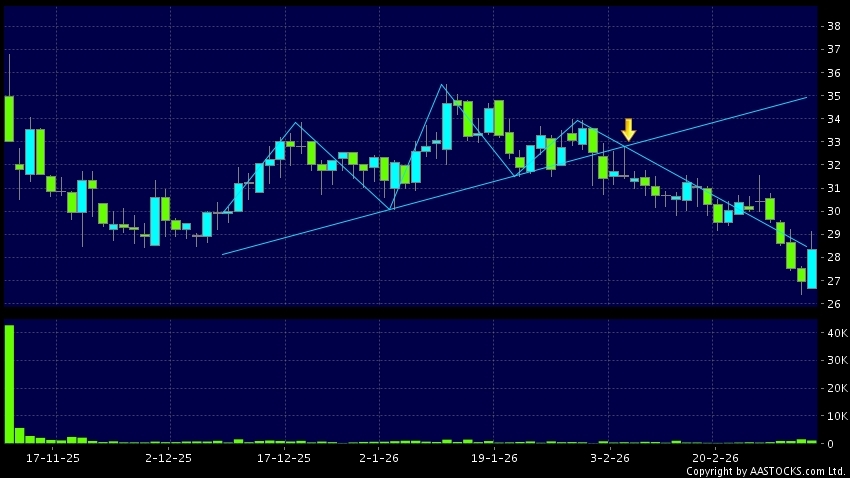 头肩顶是典型的沽出讯号,当股价跌穿支持线(颈线)时,跌势确认股价将持续下跌,技术走势偏软。(港股报价延迟最少十五分钟。沽空资料截至 2026-03-23 16:25。)