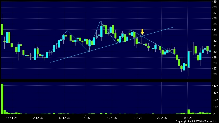 头肩顶是典型的沽出讯号,当股价跌穿支持线(颈线)时,跌势确认股价将持续下跌,技术走势偏软。(港股报价延迟最少十五分钟。沽空资料截至 2026-03-23 16:25。)