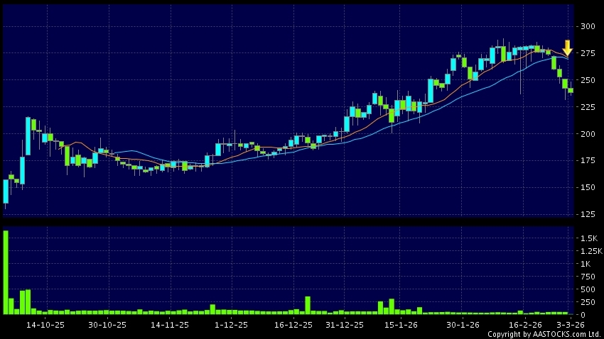 死亡交叉是一个利淡信号,指股价的短期移动平均线跌穿长期移动平均线,例如50天线跌穿250天线,在图表上构成交叉的形状。股价通常会下跌形成一个下降趋势,技术走势偏软。(港股报价延迟最少十五分钟。沽空资料截至 2026-03-31 16:25。)