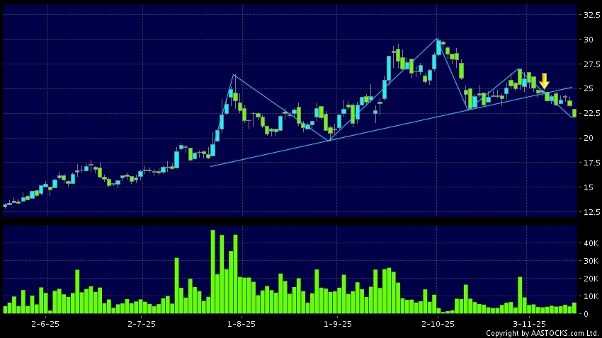 头肩顶是典型的沽出讯号,当股价跌穿支持线(颈线)时,跌势确认股价将持续下跌,技术走势偏软。(港股报价延迟最少十五分钟。沽空资料截至 2025-12-05 16:25。)