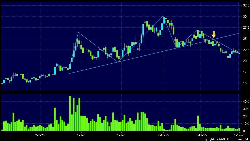 康龙化成(03759.HK) -0.060 (-0.277%) 沽空 $1.63百万; 比率 3.892% 呈现头肩顶向下突破。现价报21.740,下跌1.272%,成交量3.53百万股,成交额7.74千万。