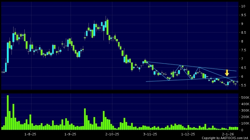 三角形向下突破是指股价的波幅渐渐收窄,在图表上形成三角形般的状态。股价在三角形的末端向下突破,下跌趋势形成,技术走势偏软。(港股报价延迟最少十五分钟。沽空资料截至 2026-01-09 16:25。)