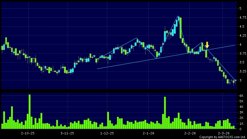 头肩顶是典型的沽出讯号,当股价跌穿支持线(颈线)时,跌势确认股价将持续下跌,技术走势偏软。(港股报价延迟最少十五分钟。沽空资料截至 2026-03-27 16:25。)