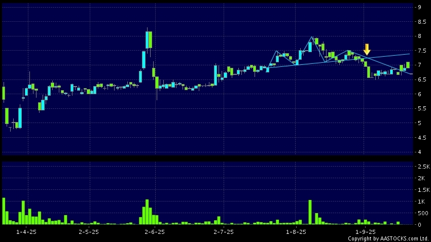 长久股份(06959.HK)呈现头肩顶向下突破。现价报6.710,下跌2.754%,成交量5.20千股,成交额3.49万。