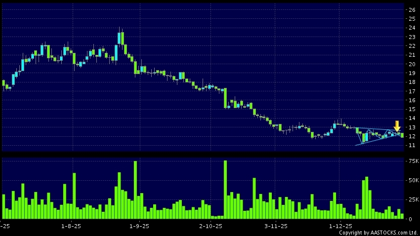 三角形向下突破是指股价的波幅渐渐收窄,在图表上形成三角形般的状态。股价在三角形的末端向下突破,下跌趋势形成,技术走势偏软。(港股报价延迟最少十五分钟。沽空资料截至 2026-01-02 16:25。)