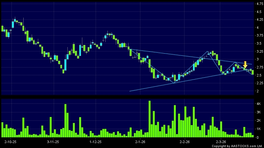 三角形向下突破是指股价的波幅渐渐收窄,在图表上形成三角形般的状态。股价在三角形的末端向下突破,下跌趋势形成,技术走势偏软。(港股报价延迟最少十五分钟。沽空资料截至 2026-03-30 16:25。)