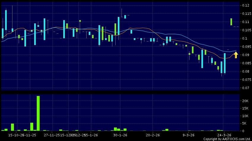 沛然环保(08320.HK) 0.000 (0.000%) 10天移动平均线升穿20天移动平均线,出现黄金交叉。现价报0.107,无升跌,成交量2.00万股,成交额2.14千。