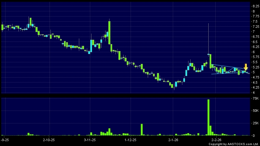 三角形向下突破是指股价的波幅渐渐收窄,在图表上形成三角形般的状态。股价在三角形的末端向下突破,下跌趋势形成,技术走势偏软。(港股报价延迟最少十五分钟。)