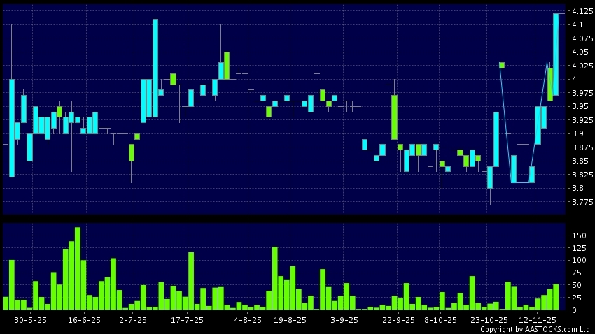 其士國際(00025.HK) +0.050 (+1.205%) 呈現杯柄形向上突破。現價報4.120,無升跌,成交量0.00股,成交額0.00。