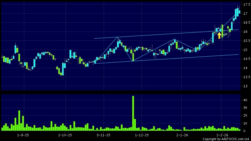 區域突破指股價在過去的一段時間只在一個範圍在內活動,然後股價上升作出突破,升穿區域的頂部,技術走勢向好。(港股報價延遲最少十五分鐘。沽空資料截至 2026-03-04 16:25。)