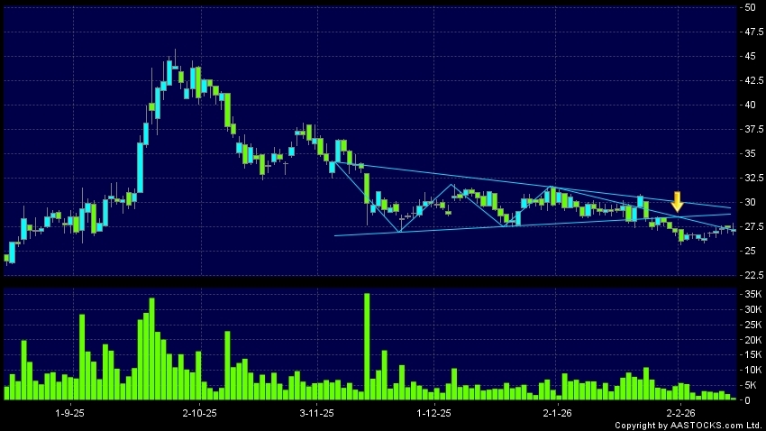 三角形向下突破是指股價的波幅漸漸收窄,在圖表上形成三角形般的狀態。股價在三角形的末端向下突破,下跌趨勢形成,技術走勢偏軟。(港股報價延遲最少十五分鐘。沽空資料截至 2026-03-04 12:25。)