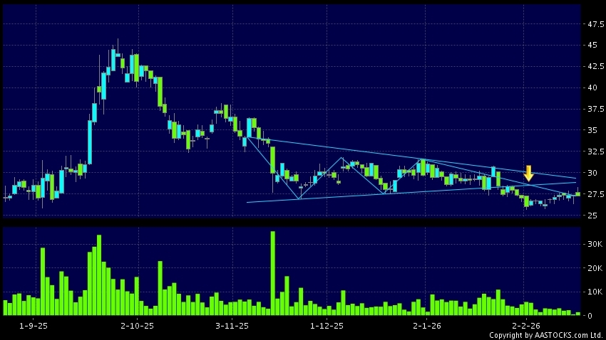 三角形向下突破是指股價的波幅漸漸收窄,在圖表上形成三角形般的狀態。股價在三角形的末端向下突破,下跌趨勢形成,技術走勢偏軟。(港股報價延遲最少十五分鐘。沽空資料截至 2026-03-04 12:25。)
