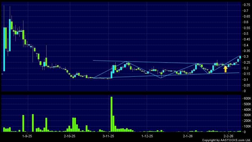 瀛晟科學(00209.HK) -0.040 (-8.000%) 呈現三角形向上突破。現價報0.305,上升8.929%,成交量1.84千萬股,成交額5.38百萬。