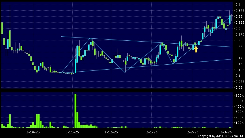 瀛晟科學(00209.HK) -0.040 (-8.000%) 呈現三角形向上突破。現價報0.355,無升跌,成交量3.69百萬股,成交額1.25百萬。