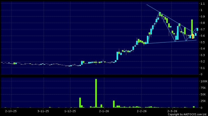 三角形向上突破是指股價的波幅漸漸收窄,在圖表上形成三角形般的狀態。股價在三角形的末端向上突破,形成上升趨勢,技術走勢向好。(港股報價延遲最少十五分鐘。)