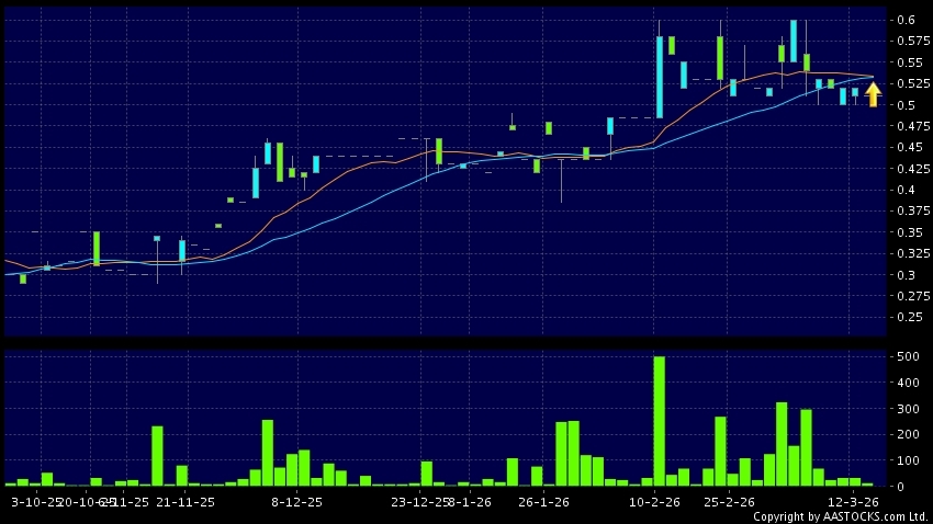 德合集團(00368.HK) +0.305 (+64.211%) 10天移動平均線升穿20天移動平均線,出現黃金交叉。現價報0.510,無升跌,成交量0.00股,成交額0.00。