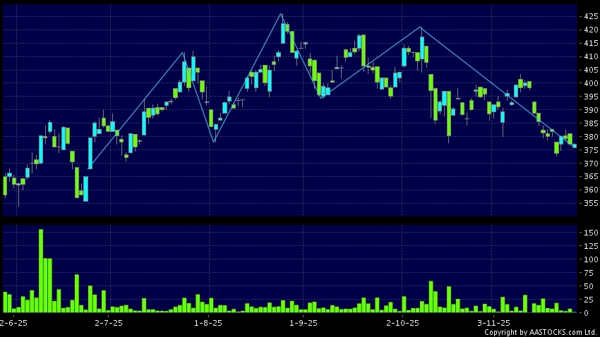 香港交易所-R(80388.HK) -2.600 (-0.690%) 沽空 $33.94萬; 比率 60.025% 呈現三重頂突破向下。現價報377.200,上升0.053%,成交量1.40千股,成交額52.77萬。