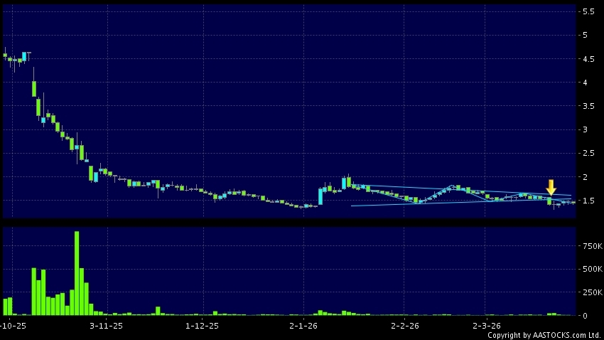 三角形向下突破是指股價的波幅漸漸收窄,在圖表上形成三角形般的狀態。股價在三角形的末端向下突破,下跌趨勢形成,技術走勢偏軟。(港股報價延遲最少十五分鐘。沽空資料截至 2026-03-30 12:25。)