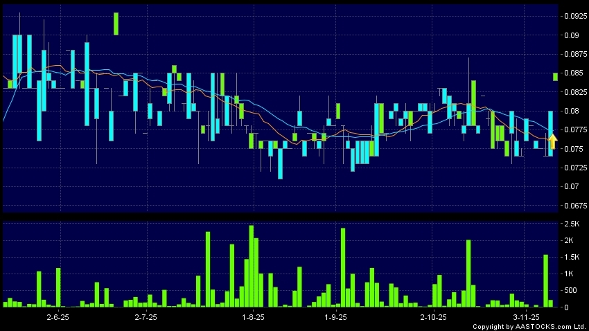 鋑聯控股(00459.HK) -0.001 (-0.813%) 10天移動平均線升穿20天移動平均線,出現黃金交叉。現價報0.084,上升5.000%,成交量1.50萬股,成交額1.21千。