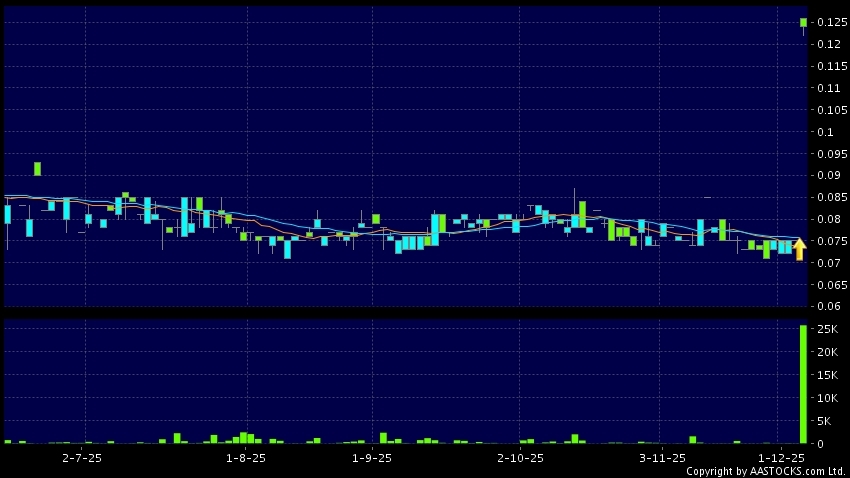 鋑聯控股(00459.HK) -0.001 (-0.813%) 10天移動平均線升穿20天移動平均線,出現黃金交叉。現價報0.124,上升65.333%,成交量2.58千萬股,成交額3.19百萬。