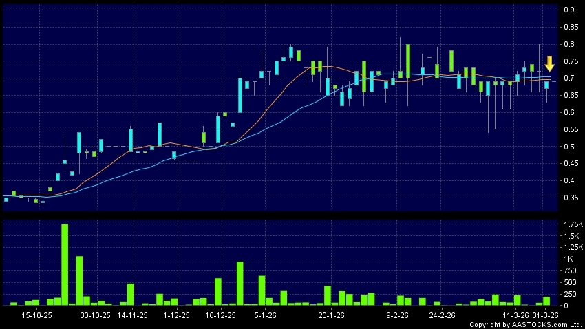 富通科技(00465.HK) -0.020 (-2.899%) 10天移動平均線跌穿20天移動平均線,出現死亡交叉。現價報0.690,無升跌,成交量0.00股,成交額0.00。