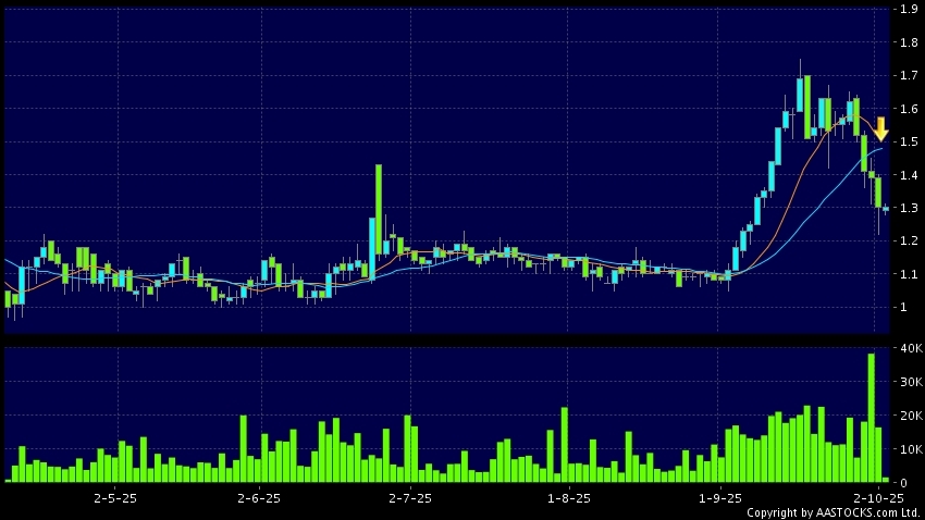 錦藝集團控股(00565.HK) -0.050 (-3.846%) 沽空 $97.15萬; 比率 17.925% 10天移動平均線跌穿20天移動平均線,出現死亡交叉。現價報1.300,無升跌,成交量1.55百萬股,成交額2.00百萬。
