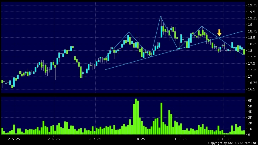 頭肩頂是典型的沽出訊號,當股價跌穿支持線(頸線)時,跌勢確認股價將持續下跌,技術走勢偏軟。(港股報價延遲最少十五分鐘。沽空資料截至 2025-10-28 16:25。)