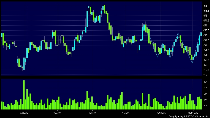 長江基建集團(01038.HK) +0.100 (+0.184%) 沽空 $1.58千萬; 比率 17.796% 呈現三重底突破向上。現價報53.300,上升0.661%,成交量2.14百萬股,成交額1.14億。