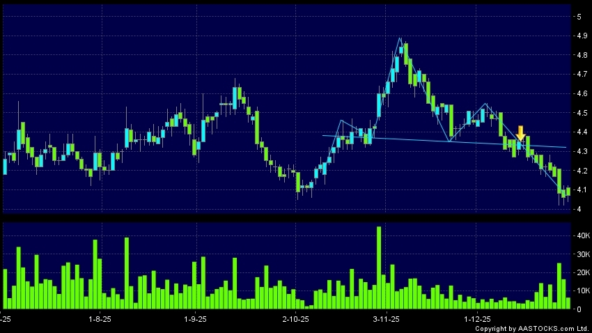 頭肩頂是典型的沽出訊號,當股價跌穿支持線(頸線)時,跌勢確認股價將持續下跌,技術走勢偏軟。(港股報價延遲最少十五分鐘。沽空資料截至 2025-12-31 12:25。)