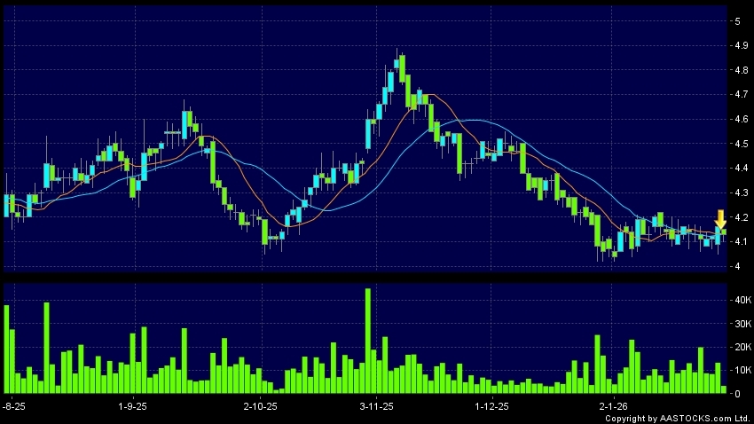 華電國際電力股份(01071.HK) +0.080 (+1.914%) 沽空 $9.33萬; 比率 0.773% 10天移動平均線跌穿20天移動平均線,出現死亡交叉。現價報4.130,下跌0.721%,成交量3.34百萬股,成交額1.38千萬。