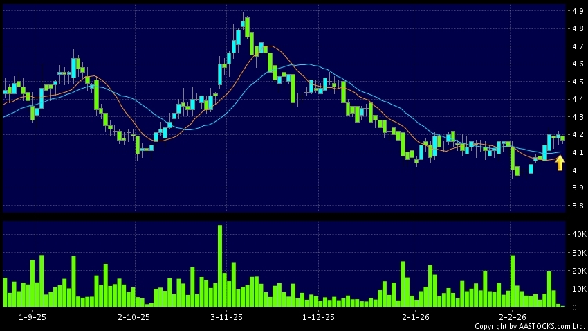 華電國際電力股份(01071.HK) +0.080 (+1.914%) 沽空 $9.33萬; 比率 0.773% 10天移動平均線升穿20天移動平均線,出現黃金交叉。現價報4.170,下跌0.714%,成交量65.84萬股,成交額2.75百萬。
