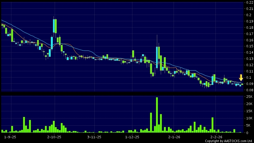 時代中國控股(01233.HK) -0.003 (-3.409%) 10天移動平均線跌穿20天移動平均線,出現死亡交叉。現價報0.088,無升跌,成交量3.50萬股,成交額3.11千。