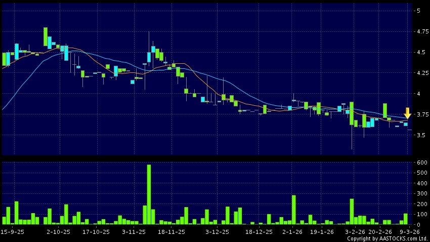 長安民生物流(01292.HK) -0.010 (-0.316%) 10天移動平均線跌穿20天移動平均線,出現死亡交叉。現價報3.560,下跌2.466%,成交量2.00千股,成交額7.12千。