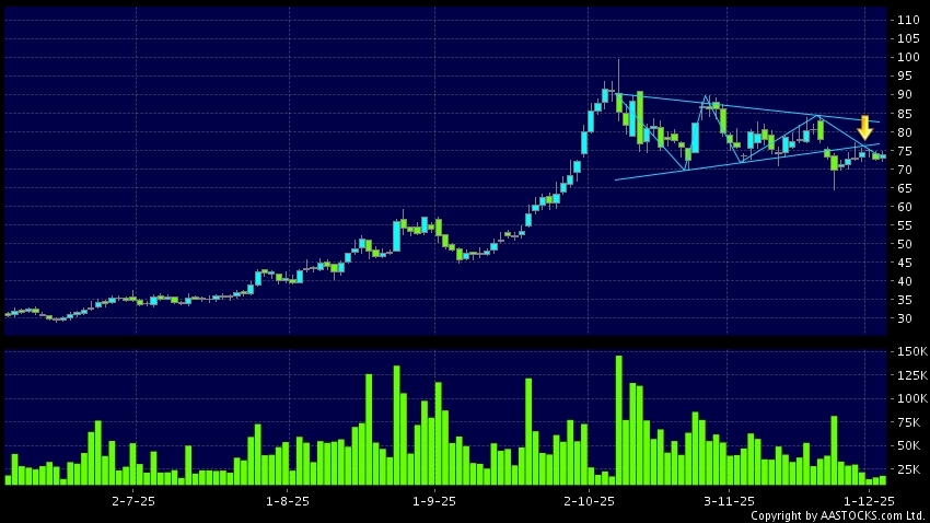 華虹半導體(01347.HK) -0.200 (-0.262%) 沽空 $2.19億; 比率 11.831% 呈現三角形向下突破。現價報73.950,上升1.580%,成交量1.77千萬股,成交額13.03億。