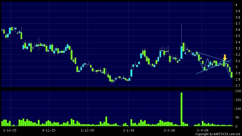 三角形向下突破是指股價的波幅漸漸收窄,在圖表上形成三角形般的狀態。股價在三角形的末端向下突破,下跌趨勢形成,技術走勢偏軟。(港股報價延遲最少十五分鐘。)