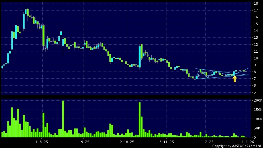 三角形向上突破是指股價的波幅漸漸收窄,在圖表上形成三角形般的狀態。股價在三角形的末端向上突破,形成上升趨勢,技術走勢向好。(港股報價延遲最少十五分鐘。沽空資料截至 2026-01-22 16:25。)