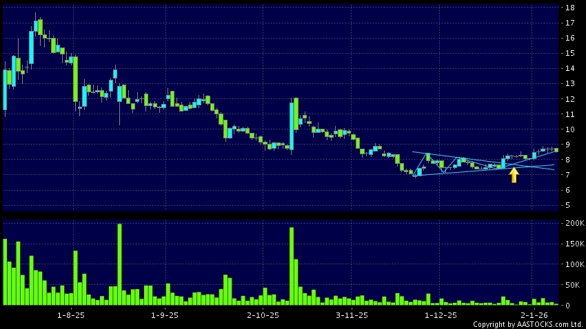 三角形向上突破是指股價的波幅漸漸收窄,在圖表上形成三角形般的狀態。股價在三角形的末端向上突破,形成上升趨勢,技術走勢向好。(港股報價延遲最少十五分鐘。沽空資料截至 2026-01-22 16:25。)