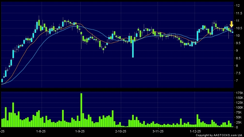 極兔速遞-W(01519.HK) +0.180 (+1.753%) 沽空 $2.33千萬; 比率 20.774% 10天移動平均線跌穿20天移動平均線,出現死亡交叉。現價報10.260,下跌0.097%,成交量4.03百萬股,成交額4.15千萬。