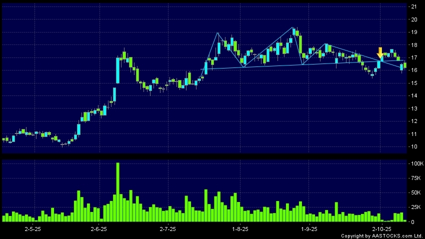 頭肩頂是典型的沽出訊號,當股價跌穿支持線(頸線)時,跌勢確認股價將持續下跌,技術走勢偏軟。(港股報價延遲最少十五分鐘。沽空資料截至 2025-10-14 16:25。)