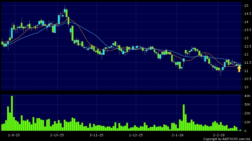 雅迪控股(01585.HK) +0.180 (+1.627%) 沽空 $7.08百萬; 比率 16.800% 10天移動平均線升穿20天移動平均線,出現黃金交叉。現價報11.370,上升0.353%,成交量1.30百萬股,成交額1.47千萬。