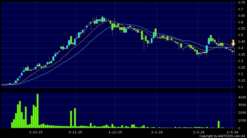七元投資(01660.HK) -0.005 (-1.351%) 10天移動平均線跌穿20天移動平均線,出現死亡交叉。現價報0.365,下跌1.351%,成交量1.68百萬股,成交額63.77萬。