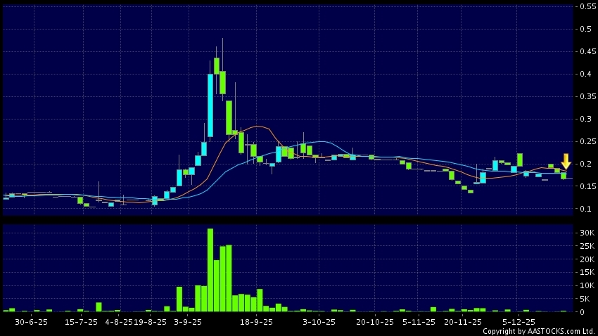 成志控股(01741.HK) -0.009 (-5.325%) 10天移動平均線跌穿20天移動平均線,出現死亡交叉。現價報0.168,無升跌,成交量0.00股,成交額0.00。