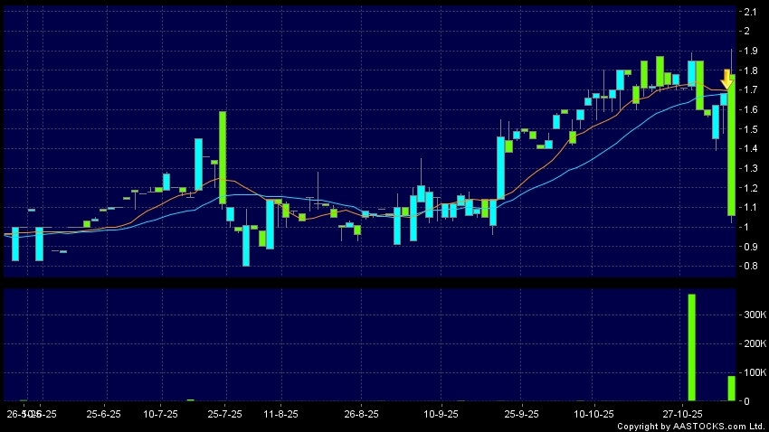 榮尊國際控股(01780.HK) -0.090 (-10.345%) 10天移動平均線跌穿20天移動平均線,出現死亡交叉。現價報1.050,下跌37.500%,成交量8.73千萬股,成交額1.33億。