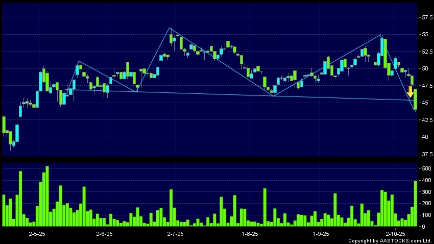 小米集團-WR(81810.HK) -2.500 (-5.241%) 沽空 $2.57百萬; 比率 9.328% 呈現頭肩頂向下突破。現價報44.320,下跌7.086%,成交量40.06萬股,成交額1.83千萬。