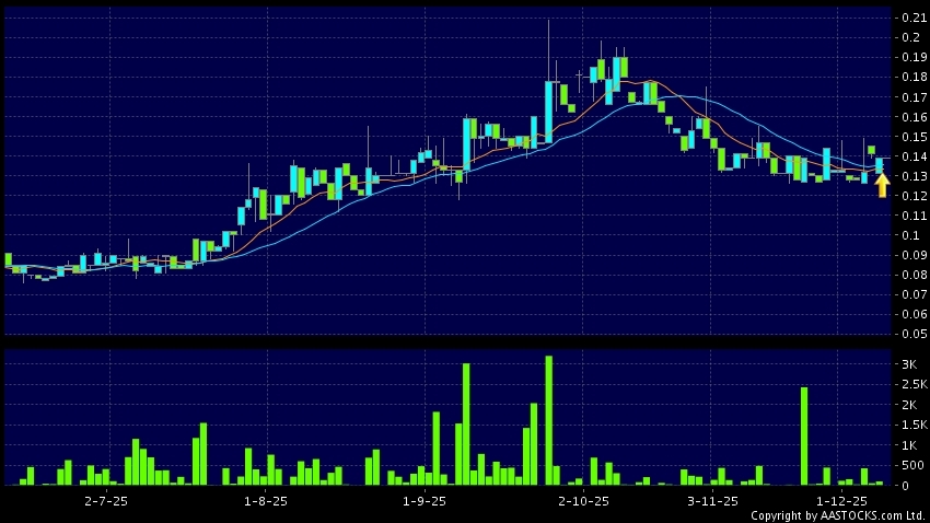 STERLING GP(01825.HK) -0.006 (-4.317%) 10天移動平均線升穿20天移動平均線,出現黃金交叉。現價報0.139,無升跌,成交量0.00股,成交額0.00。