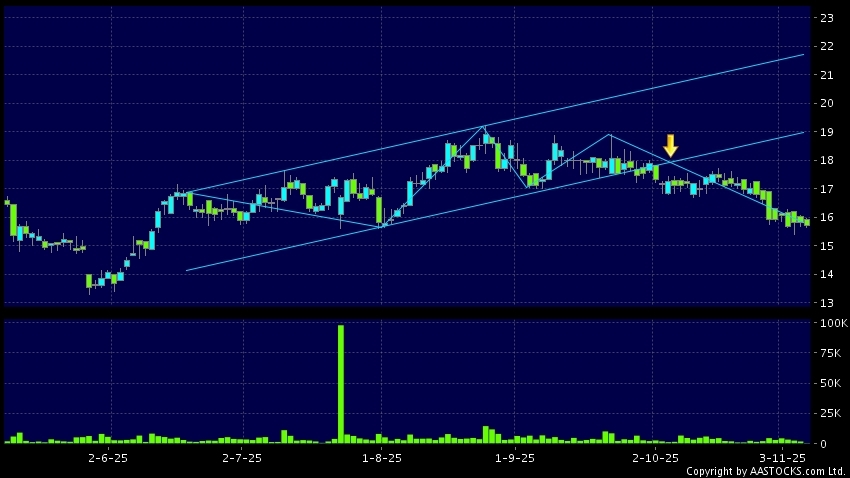 區域突破指股價在過去的一段時間只在一個範圍在內活動,然後股價下跌作出突破,跌穿區域的底部,技術走勢偏軟。(港股報價延遲最少十五分鐘。沽空資料截至 2025-11-07 16:25。)