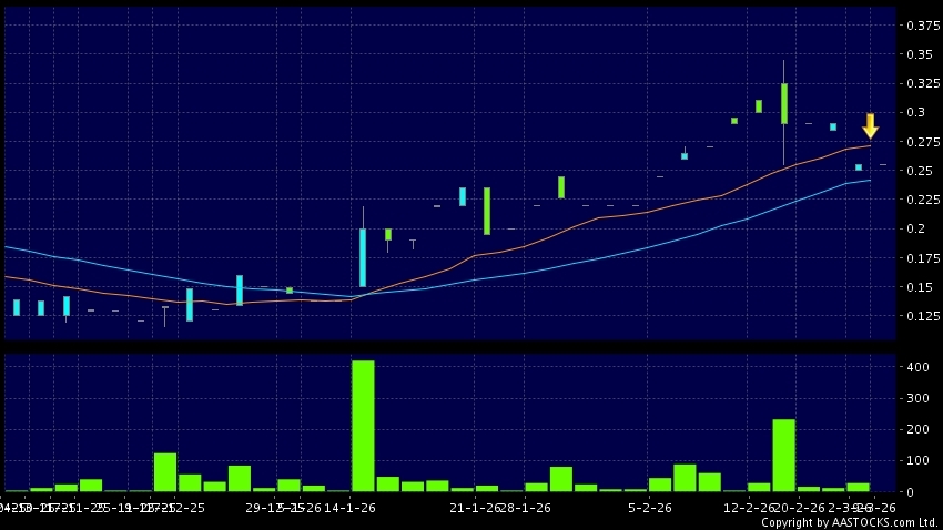 中漆集團(01932.HK) +0.015 (+6.818%) 10天移動平均線跌穿20天移動平均線,出現死亡交叉。現價報0.255,無升跌,成交量0.00股,成交額0.00。